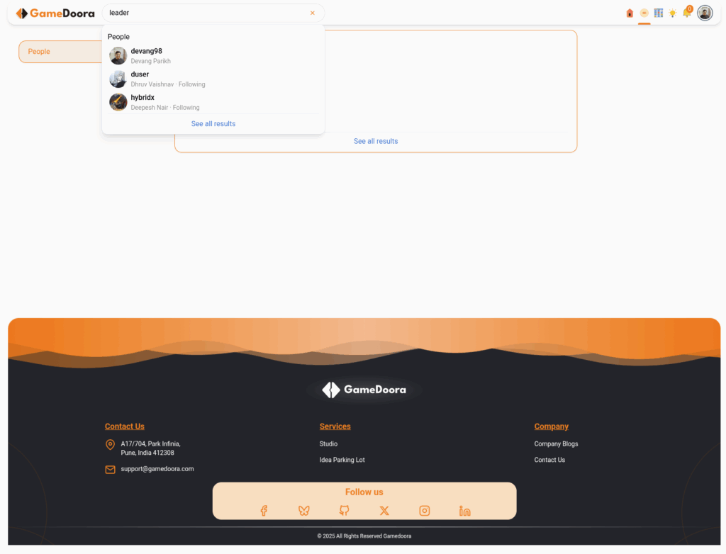 With Gamedoora’s intelligent skill tagging and searchable database, your expertise doesn’t just sit idle. When someone looks for a “leader,” “game designer,” or “UI/UX developer,” your profile pops up — instantly connecting you with opportunities and collaborators.