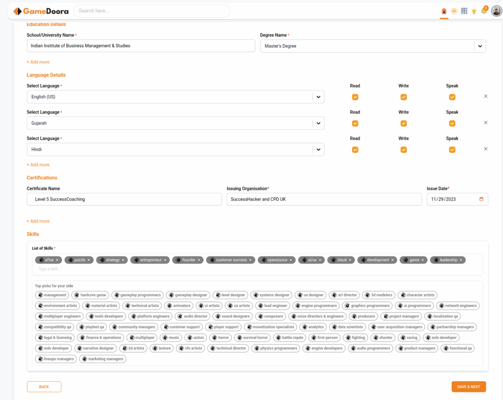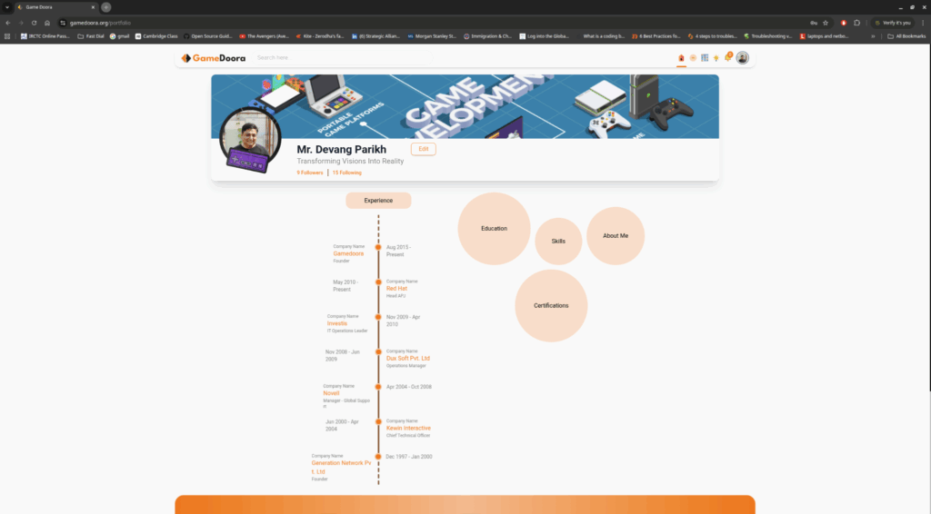 Gamedoora’s infographic profile layout helps you visualize your career path, from education and experience to certifications and projects, in an elegant timeline view.